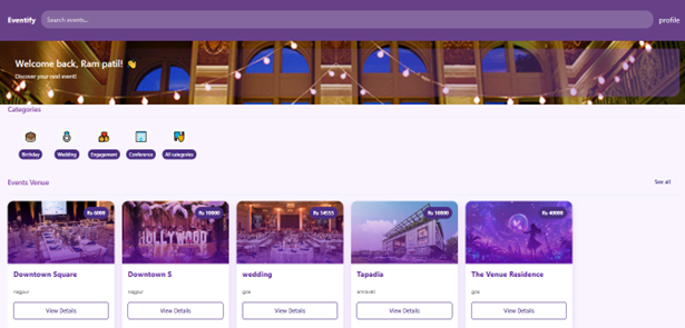Browse event venues by category (Wedding, Birthday, Corporate, etc.).